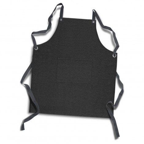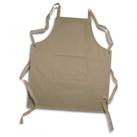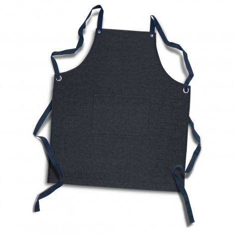 Fashion inspired cotton bib apron with a medium pocket on the front and gunmetal rivets. It has interchangeable coloured cotton straps which cross over at the back for an adjustable fit. The straps feature a gunmetal dome for easy removal of straps.