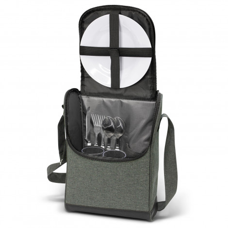 Exceptional two-person picnic set which is manufactured from strong 600D poly-canvas with a two-tone heather finish. The bag has a large zippered main compartment, a large front slip pocket, a carry handle with a PU cuff and an adjustable shoulder strap with silver metal buckles. The picnic set includes two acrylic glasses, two knives, forks and spoons, two plates and two elastic loops to secure a bottle of wine.